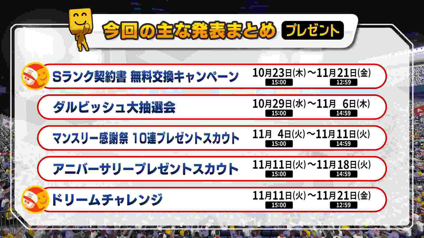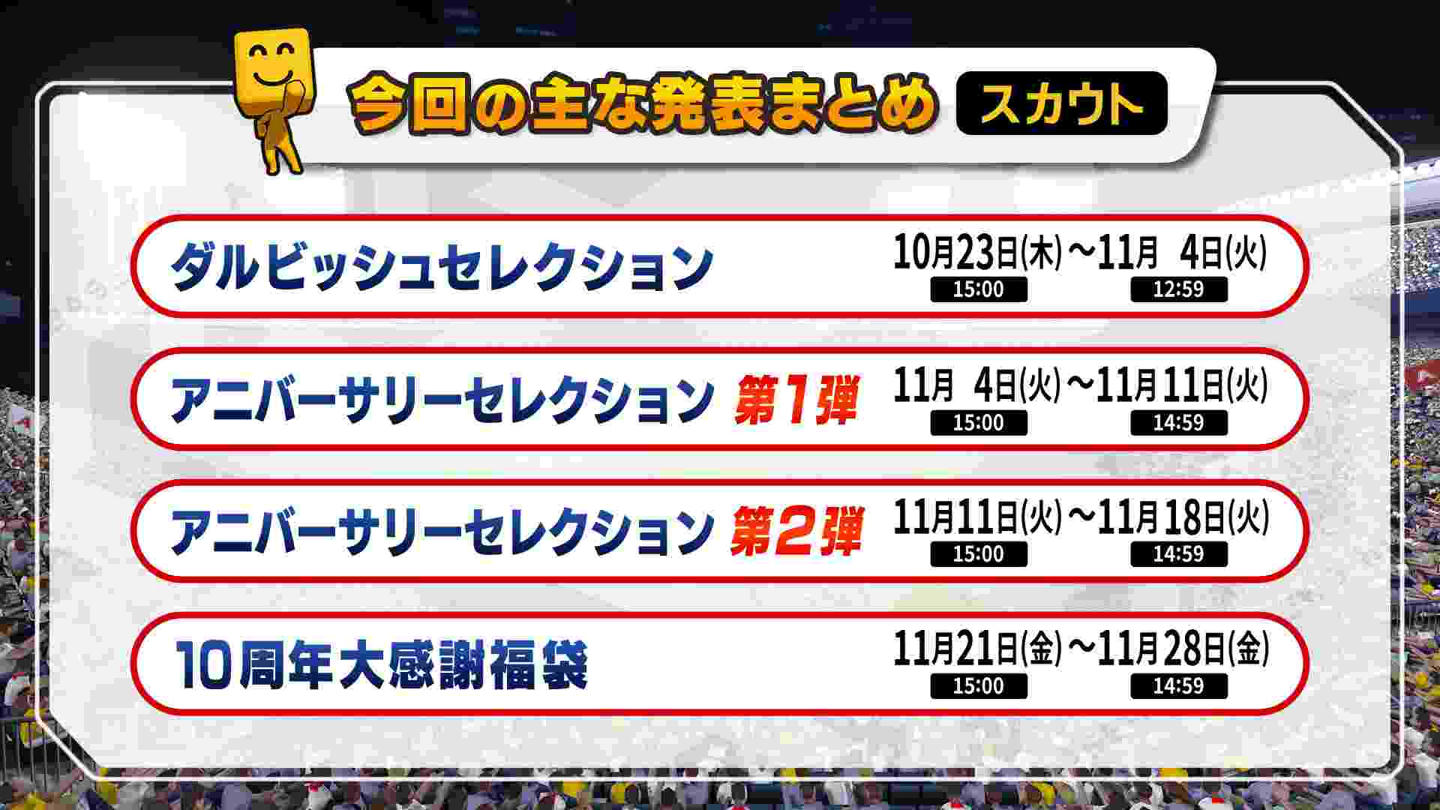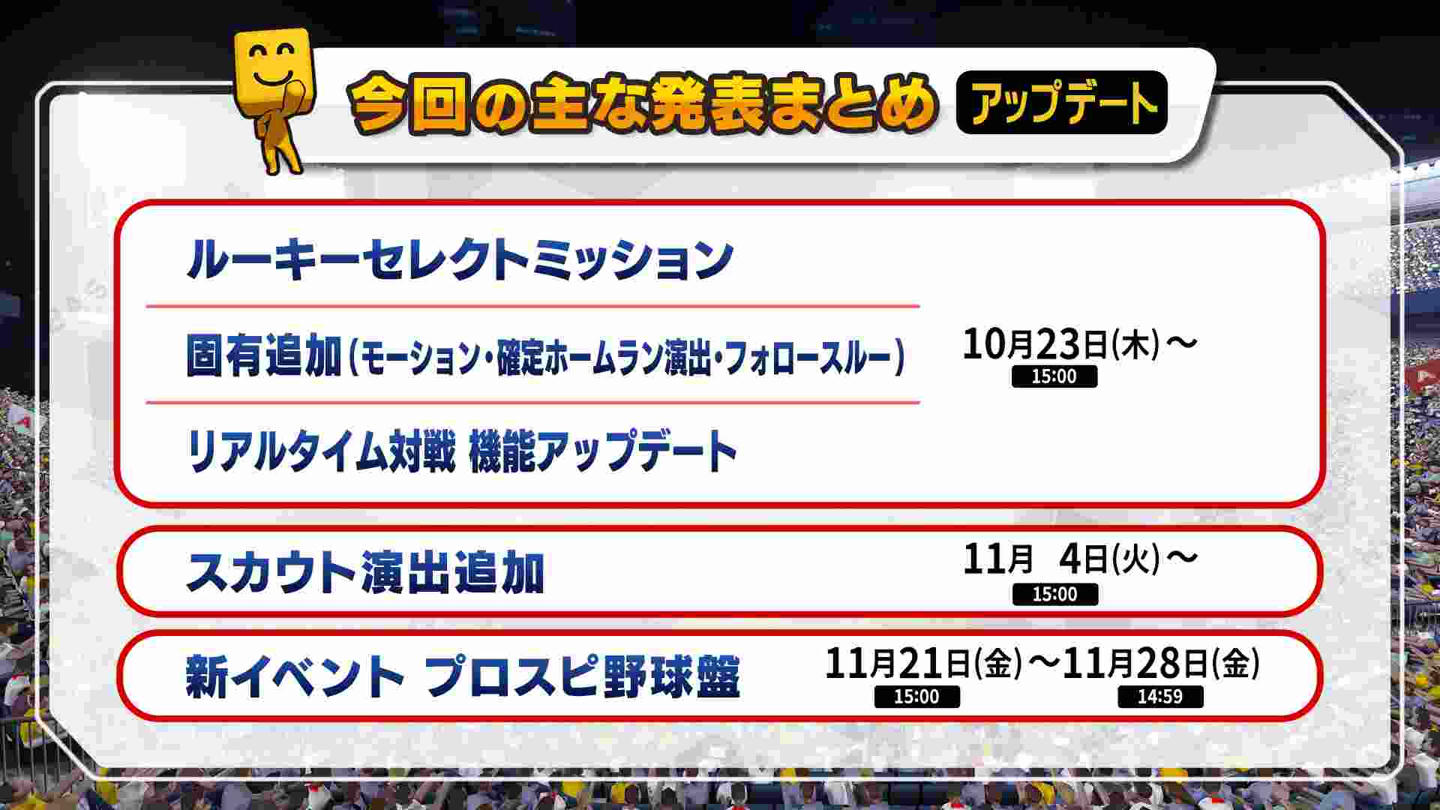 スピニュース発表内容おさらい&10周年記念特設サイト公開!10月18日(土)に生配信した「プロスピAニュース 10周年記念スペシャル」の内容をおさらい!今回発表した内容はこちら!詳細は「プロスピAニュース 10周年記念スペシャル」のアーカイブをチェック!アーカイブはこちらから! さらに、スピニュース内で告知した10周年記念サイトが本日オープン!10周年のゲーム内キャンペーンのロードマップや、「プロスピA プレイデータ」を公開中!ユーザー数推移、Sランク選出回数ランキングなど、プロスピAの10年間のデータを見てみよう!10周年記念サイトはこちらから!